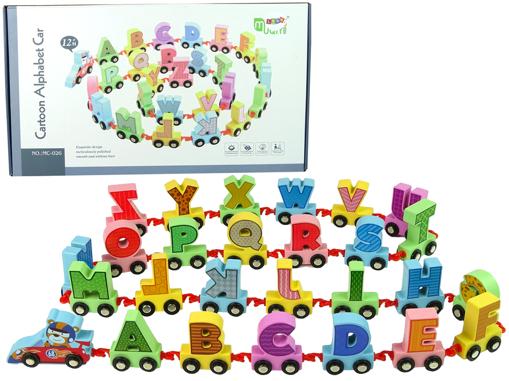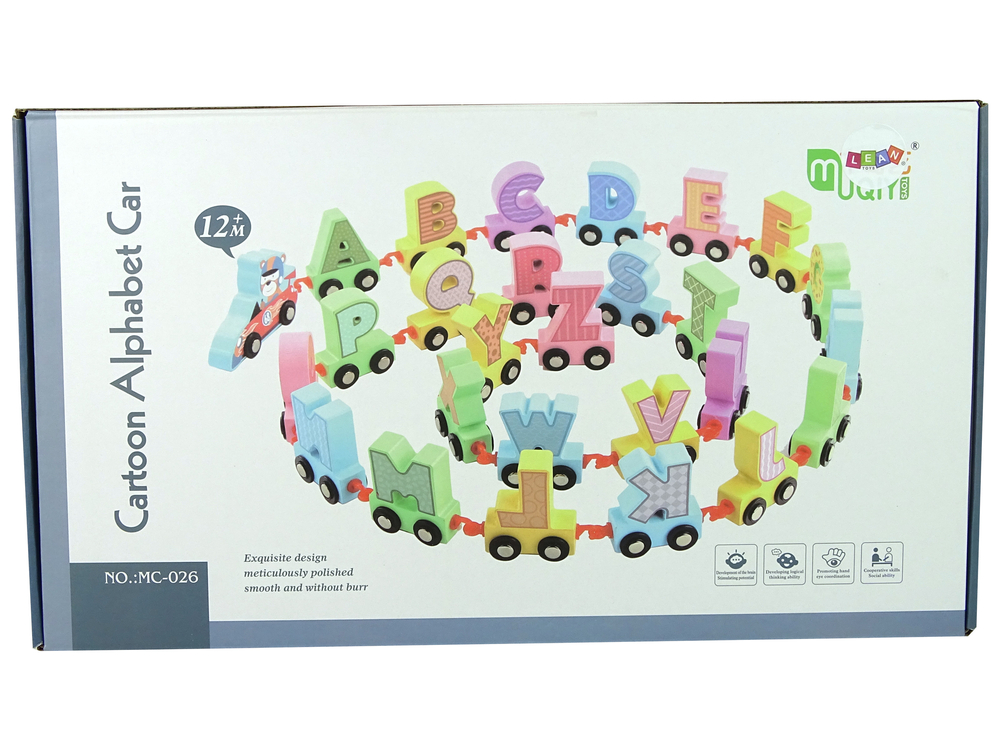 Setul include 26 de vagoane si o locomotiva. Fiecare litere este reprezentata intr-o culoare diferita si are un model individual desenat. Toate litere se misca pe roti micute din lemn, astfel, in timpul jocului, micutii vor putea conecta vagoanele intre ele conform sirului de litere.