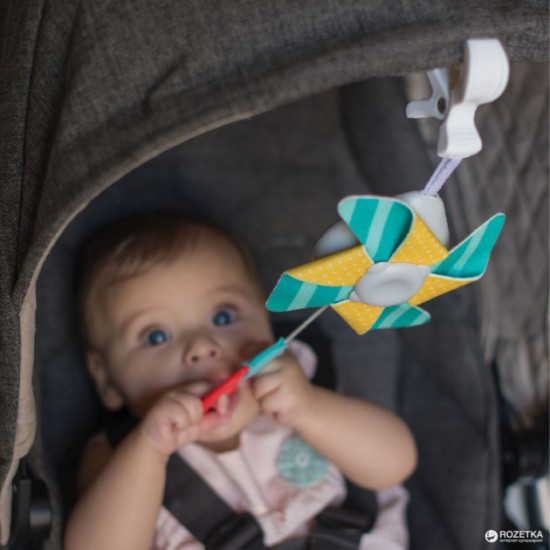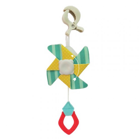 Un pandantiv frumos, cu modele contrastante, care se rotesc atunci cand copilul trage inelul. Poate fi montat pe carucior cu o clama usor de utlizat.