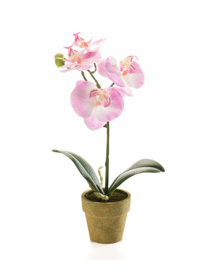 Orhideea artificiala mini Phalaenopsis roz, de 25 cm, impresioneaza prin delicatetea florilor si finisajul realist. Realizata din mase plastice, este ideala pentru decor elegant si feminin. Vine in ghiveci decorativ, gata de expunere.