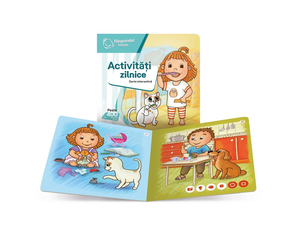 Toyland iti pune la dispozitie noul set RASPUNDEL ISTETEL Carte interactiva ACTIVITATI ZILNICE. Vino sa petrecem o zi impreuna cu fratii Iulia si Ionut dar si cu prietenii lor de nadejde, catelul Max si pisica Mina. Treziti-va impreuna, spalati-va pe dinti, mancati ceva bun la pranz, jucati-va si cantati! Fiecare activitate zilnica este insotita de un cantec distractiv! Peste 400 de sunete si versuri.