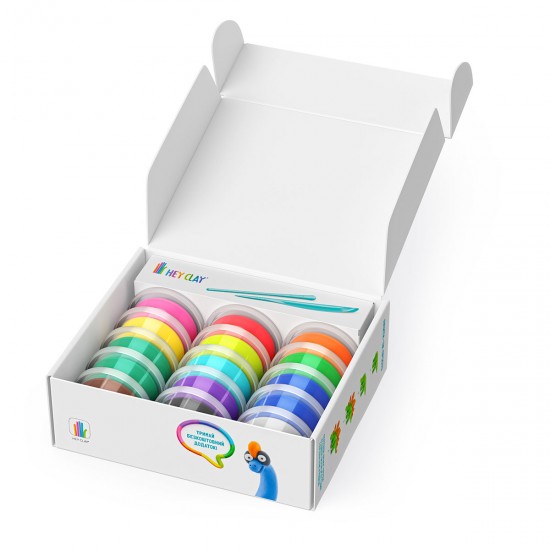 Setul include 15 recipiente cu plastilina de diferite culori, unele dintre ele fiind combinate.