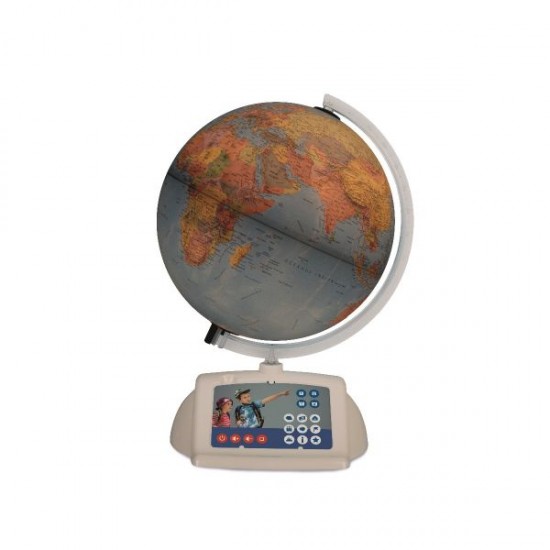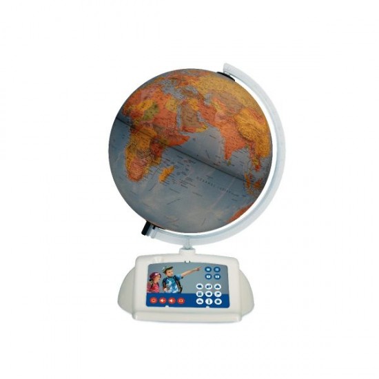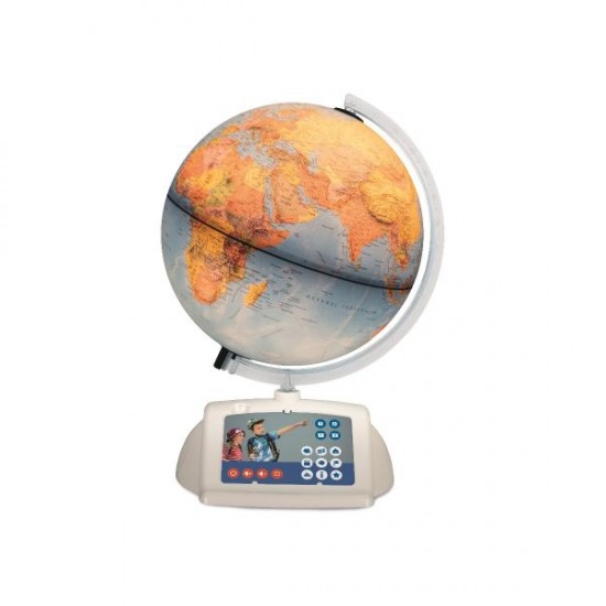Globul pamantesc interactiv este un produs inovativ din Gama Raspundel Istetel. El functioneaza impreuna cu creionul vorbitor Albi care nu este inclus in pachet. La o simpla atingere cu varful creionului, Albi va reda informatii despre acea tara / capitala / loc de pe glob, in limba romana. Ghidati de globul interactiv, copiii vor invata, in joaca, sa recunoasca tarile si capitalele lumii. In plus, pentru fiecare tara exista imnul national, informatii referitoare la populatie, limba oficiala, geografie politica si geografie fizica, curiozitati sau obiective turistice. De asemenea copiii isi pot verifica cunostintele acumulate cu ajutorul testelor si jocurilor interactive. Globul a fost dezvoltat in colaborare cu experti renumiti din domeniul geografiei, datele folosite pentru acesta fiind cat se poate de corecte si actualizate. Contine peste 1.800 de sunete si texte. Pachetul contine: • globul pamantesc cu harta politica si descrieri in limba romana • suportul • bratul/meridian • unitatea de iluminat neinlocuibila • cablul USB, inclusiv comutatorul • manualul de utilizare si instructiuni de siguranta • cardul cu pictograme de control Pachetul nu contine adaptorul c.a./c.c.! Se poate folosi adaptorul furnizat in pachetul achizitionat odata cu creionul Albi. Diametru: 30 cm; Inaltime: 41 cm; Scara: 1:42 000 000.