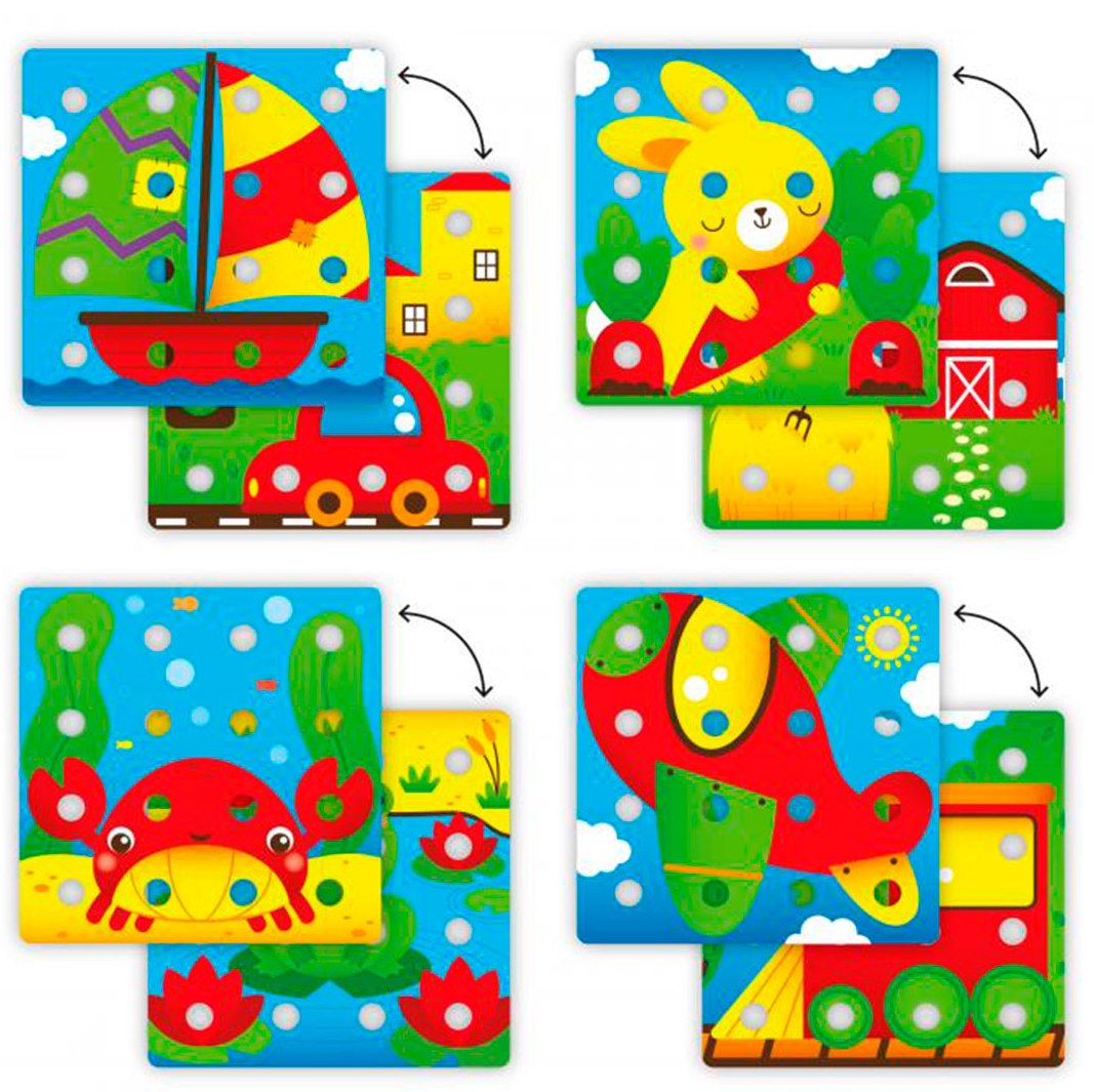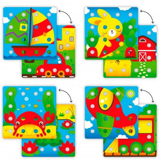 Caracteristici: 16 jetoane de diferite culori. Copilul va putea crea imagini pe baza mostrelor sau pe baza propriilor povesti Datorita acestui set de joaca copilul isi va dezvolta creativitatea, imaginatia, abilitatile motrice fine.