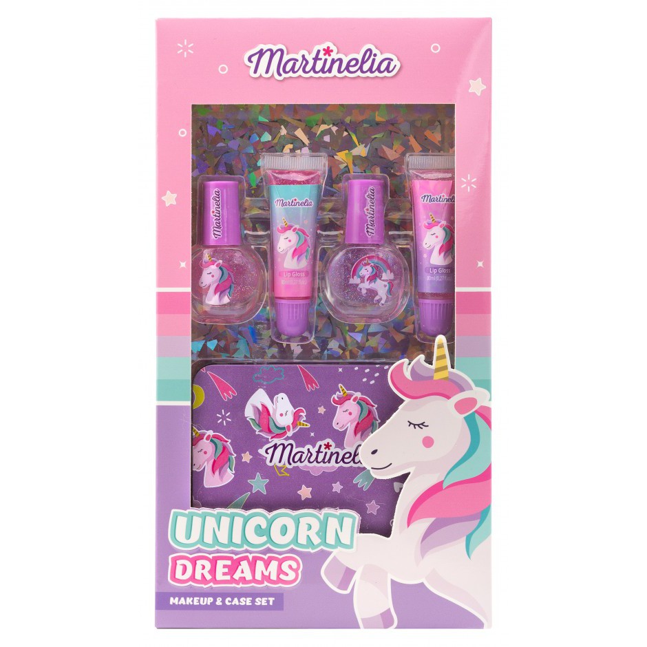 Setul Martinelia Visele Unicornului contine: 2 balsamuri pentru buze, 2 oje si o cutiuta care poate fi folosita ca portmoneu.