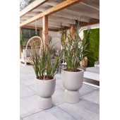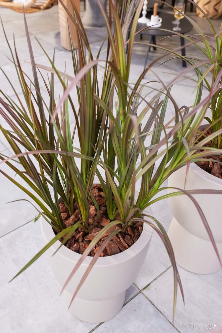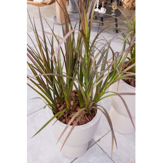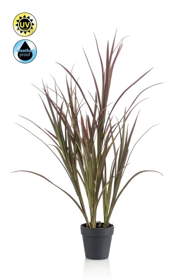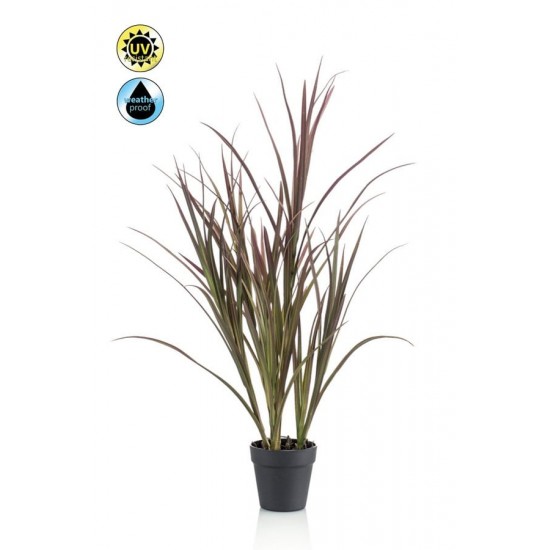 Aceasta iarba decorativa artificiala in nuante de visiniu si verde inchis aduce un accent modern si elegant. Cu inaltimea de 90 cm si plasata in ghiveci, este confectionata din mase plastice cu protectie UV.