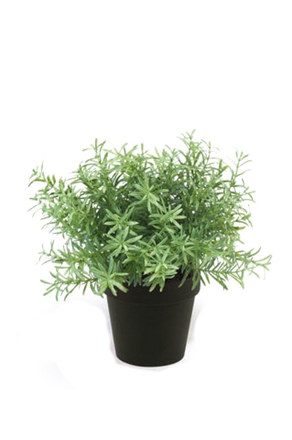Aceasta tufa artificiala de rozmarin, cu o inaltime de 20 cm, aduce un plus de eleganta prin frunzele sale subtiri de un verde deschis. Plasata intr-un ghiveci negru simplu, este ideala pentru decor modern sau rustic. Realizata din mase plastice de calitate, planta are un aspect natural si placut.