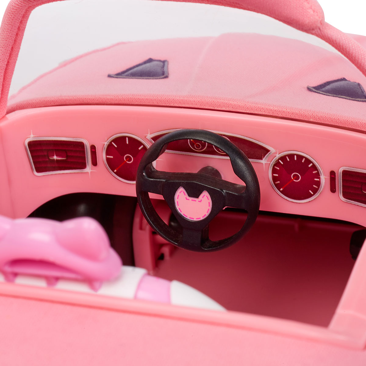 Masinuta textila cu chip de pisica Na! Na! Na! Surprise - eleganta si confortabila se combina perfect cu orice papusa din aceeasi serie. Masina decapotabila are botisor, urechi si codita ca o pisica adevarata. Rotile i se rotesc, are volan si este incapatoare.