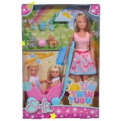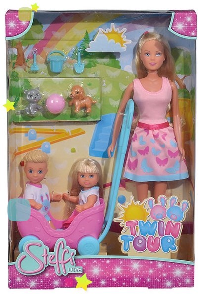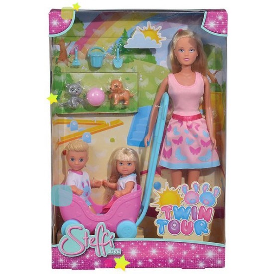 Setul de papusi "Twin Tour" include papusile Steffi, Evi si Timmy, carucior pentru gemeni, cainisor, motanas si accesorii.