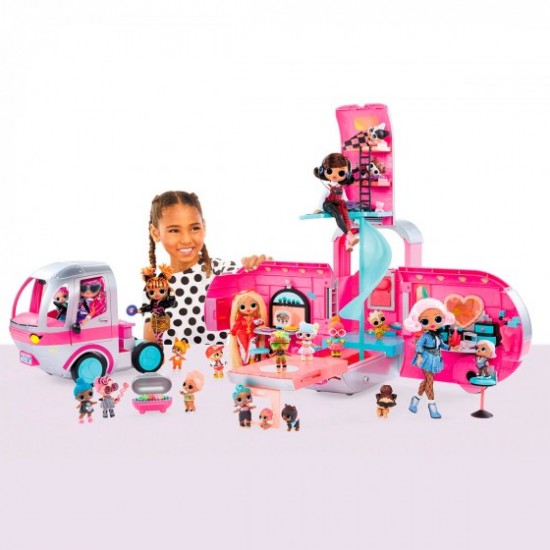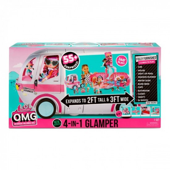 Camper 4-in-1: masina, cabina, podium de moda si piscina. Exista peste 55 de surprize de despachetat si peste 10 zone de joc in interior. Setul este potrivit pentru papusi de moda O.M.G. si papusi L.O.L. SURPRISE!