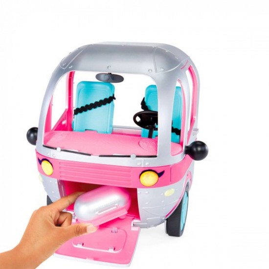 Super set L.O.L. SURPRISE! - GLAMOUR 4 IN 1 CAMPER - camper elegant actualizat pentru calatorii nebunesti. Combinatia dintre acoperirea argintie si elemente fucsia stralucitoare nu va va lasa indiferenti!