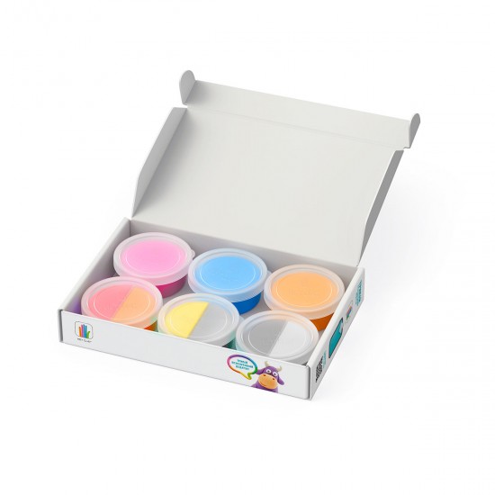 Setul include 6 recipiente cu plastilina de diferite culori, unele dintre ele fiind combinate.