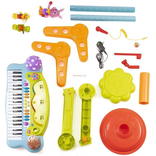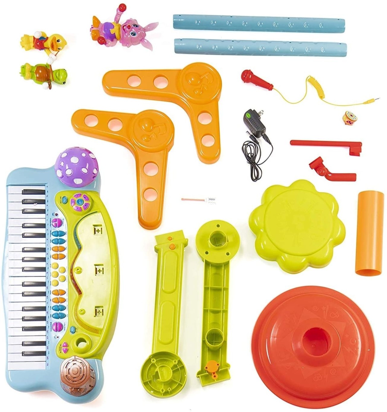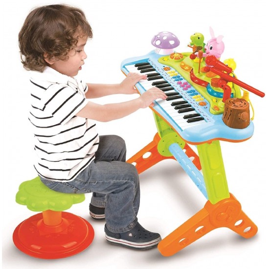 Jucarie educativa "Pianul Interactiv" este o jucarie multifunctionala cu care iti vei putea dezvolta abiliatile muzicale. Pianul este instalat pe un suport, include si un scaun inalt. Cu ajutorul unui microfon, ve-i putea sa canti si sa inregistrezi capodoperele muzicale. Jucaria este echipata cu doua moduri de redare a muzicii, trei moduri de a invata sa canti la pian, 8 stiluri muzicale diferite si 22 de melodii de ales.