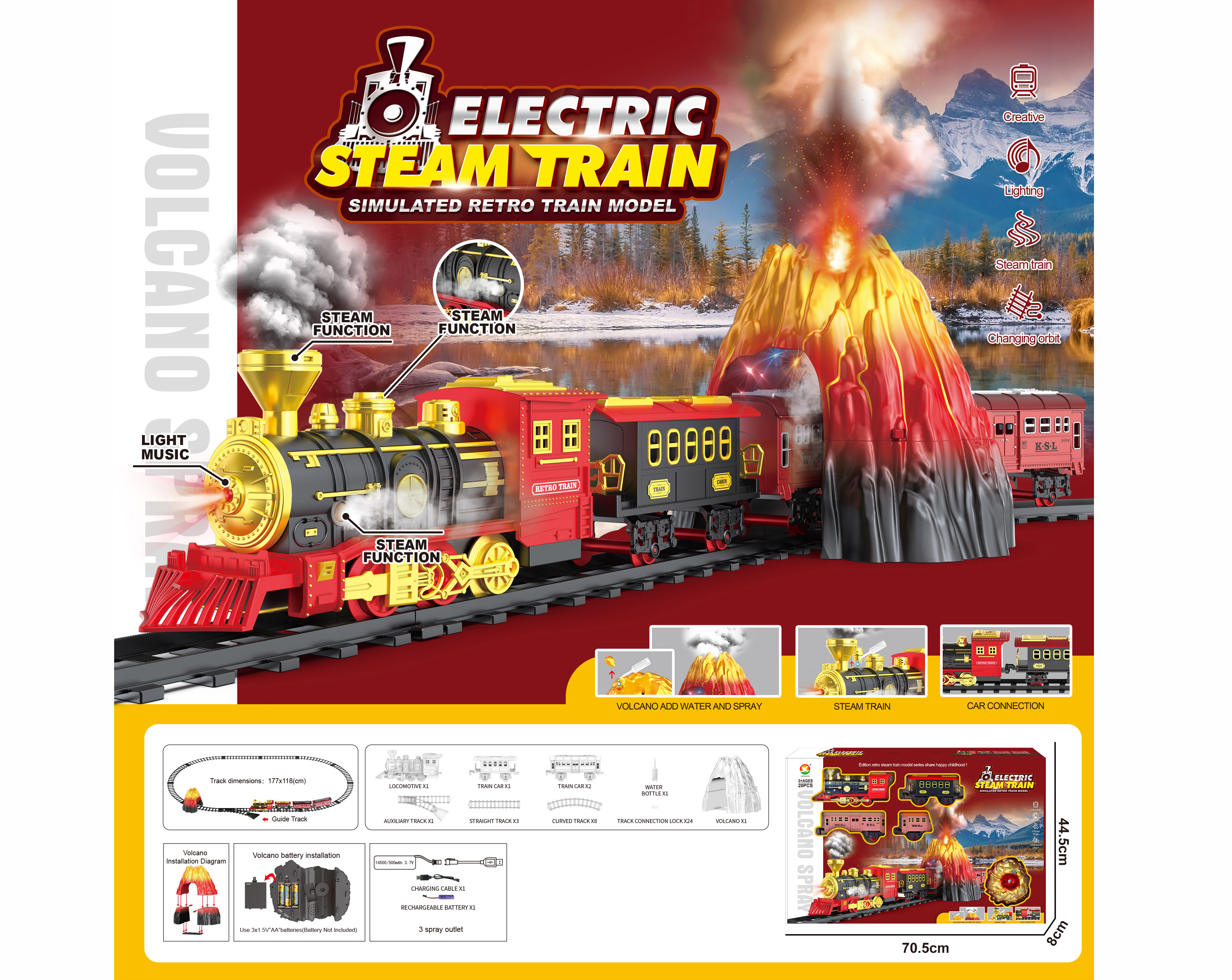 Setul este format din 20 elemente realizate cu precizie si frumos finisate, care pot fi aranjate dupa propria imaginatie. Mai mult, trenul emite 3 efecte de fum, lumini si sunete.