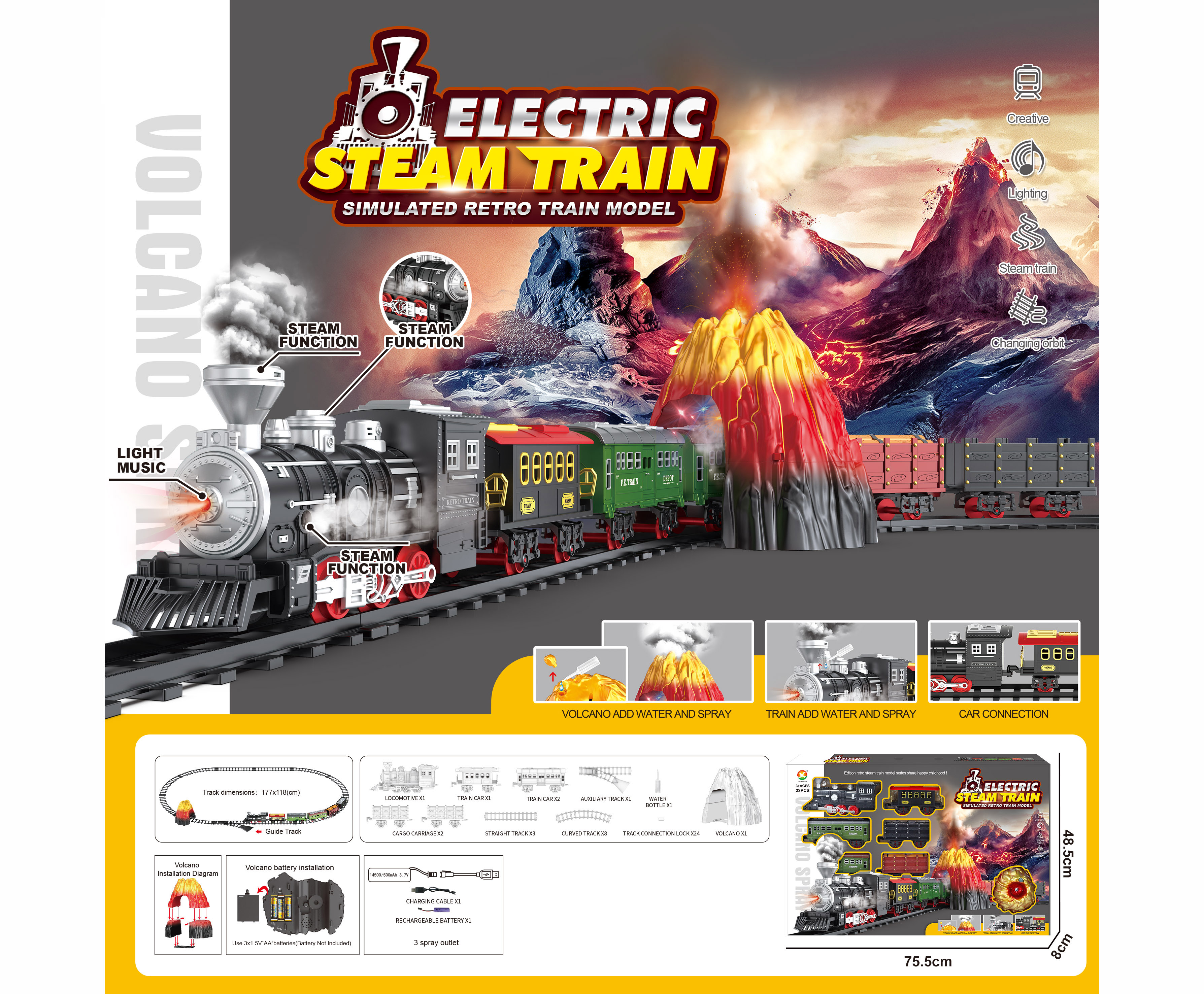 Setul este format din 22 elemente realizate cu precizie si frumos finisate, care pot fi aranjate dupa propria imaginatie. Mai mult, trenul emite 3 efecte de fum, lumini si sunete.