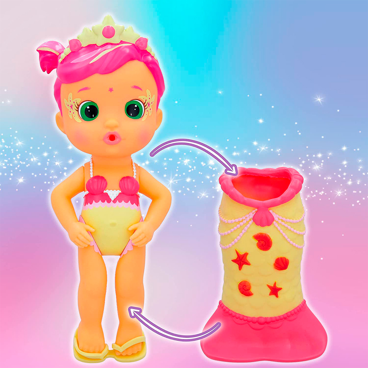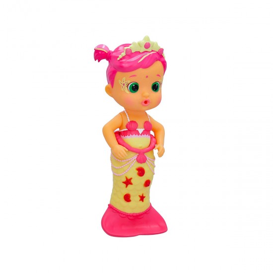 Papusa are o coada frumoasa de sirena cu sclipici si o diadema fermecatoare.