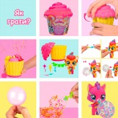 In interiorul cupcake-ului vei gasi un personaj de colectie, accesorii si baloane!
