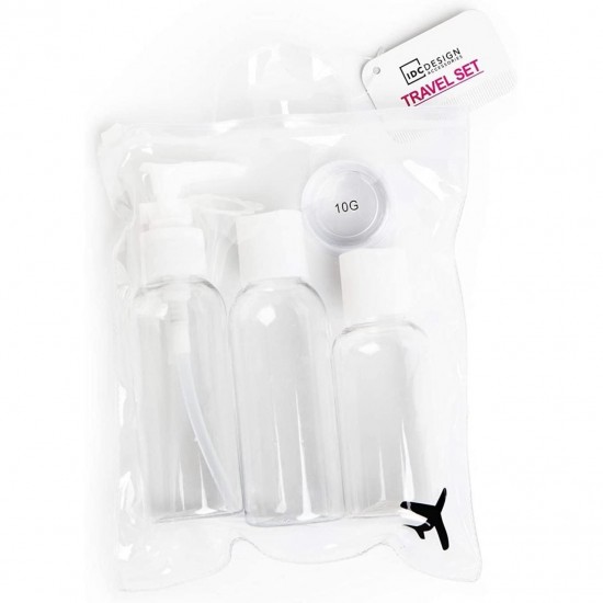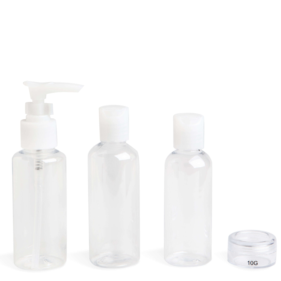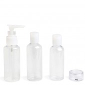 Set 3 recipiente pentru produse cosmetice transparente, inclusiv un recipient cu pompita si etui transport. Perfecte pentru avion.