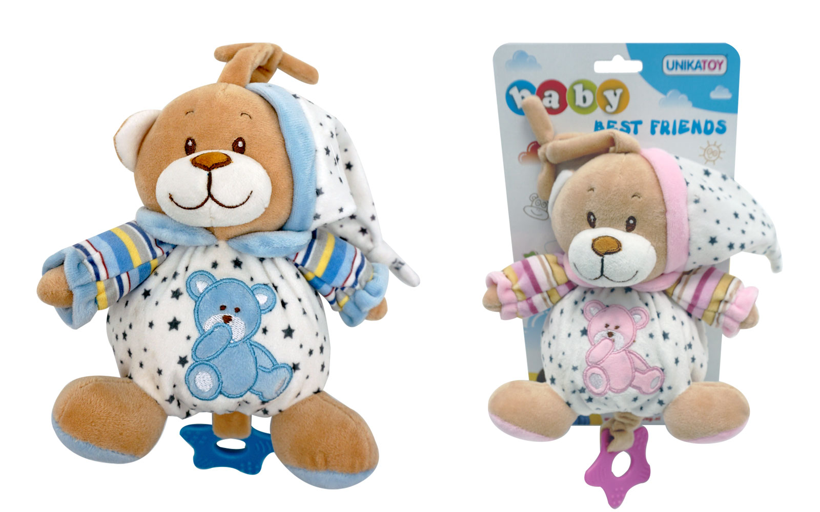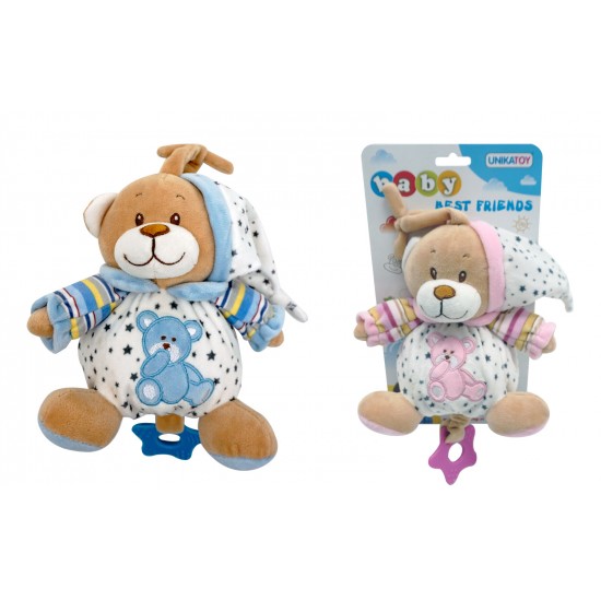 Jucarie de plus de agatat Urs cu pijama roz/albastra cu element dentitie 16CM UNIKATOY 25451