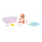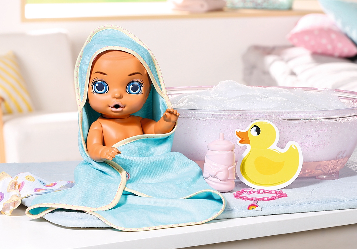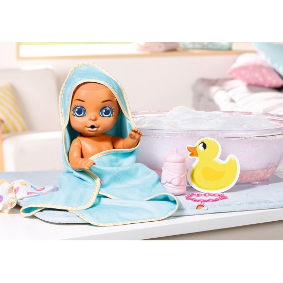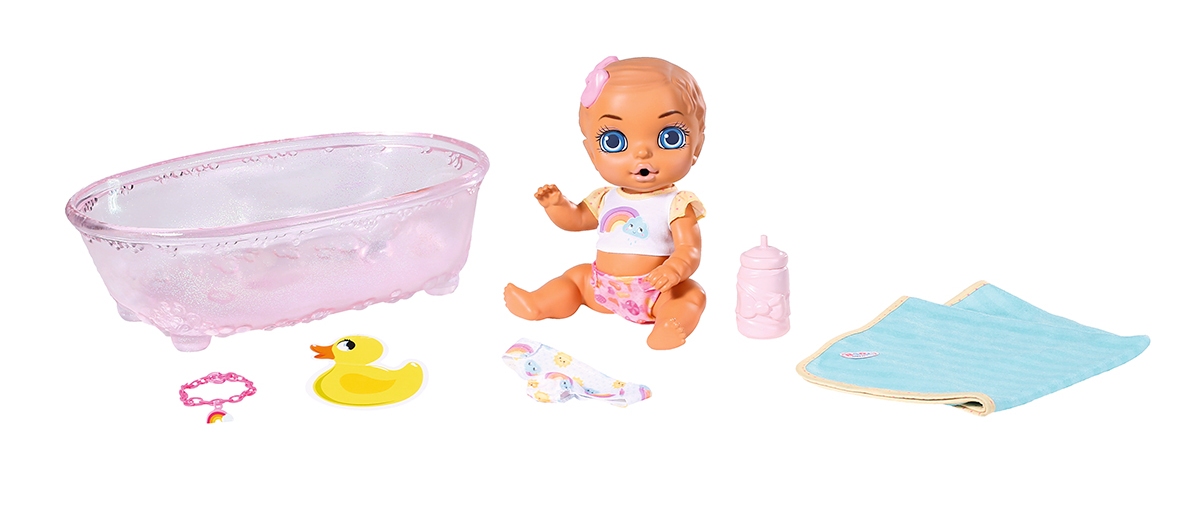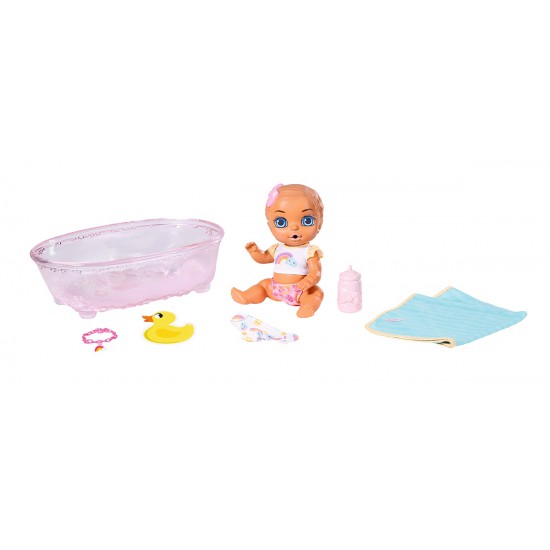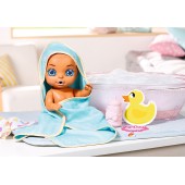 Papusei Baby Born ii plac distractiile nautice si sa se distreze in baie. Stergeti ochii papusei cu un servetel umed si vedeti culoarea ochilor Culoarea parului papusii se schimba odata ce atinge apa. Papusei ii place sa bea din sticluta iar atunci cind face pipi in scutec, el isi schimba culoarea. Setul include: papusa (28 cm), baie, 2 scutece, sticluta, bratara cu pandantiv, hainute. Recomandat copiilor de la 3 ani. Confectionat din materiale polimerice.