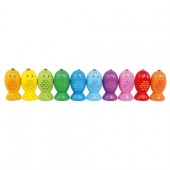 Asocieri vizuale intre cifra - ca figurina din lemn si numarul de inele colorate corespunzatoare.