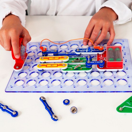 Setul include instructiuni cu ajutorul carora vei putea asambla 118 circuite electrice. Acest set va dezvolta abilitatile motorii fine, atentia, logica si memoria.