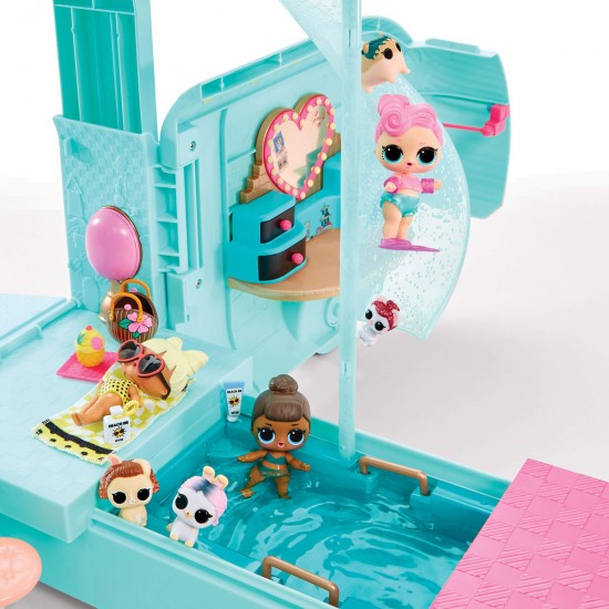 Setul include o masina, o casa, un podium de moda, o piscina si peste 50 de surprize.