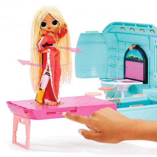 Partea din fata devine o masina separata, iar partea din spate se pliaza si se transforma intr-o zona de divertisment in care papusile pot experimenta viata plina de farmec.