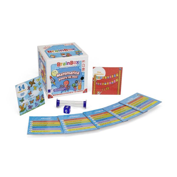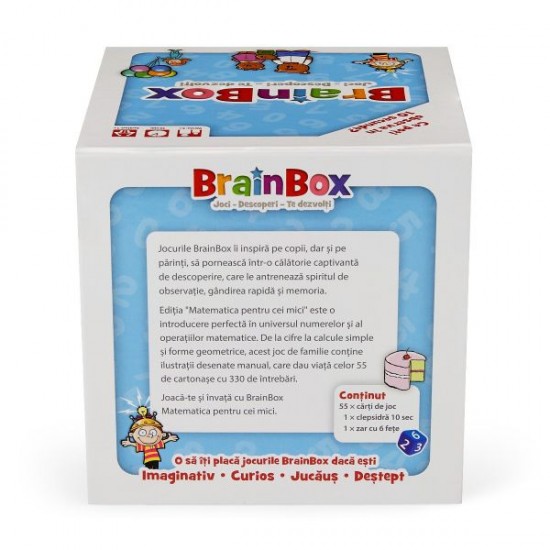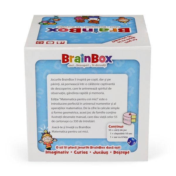 BrainBox Matematica pentru cei mici - Joc carti, educativ, copii peste 5 ani BrainBox este joc de carti distractiv de memorie si observare, testвnd atentia la detalii. Ce iti poti aminti in doar 10 secunde? Aceasta editie de joc pentru matematica iti ajuta copilul sa aiba un bun inceput in ceea ce priveste abilitatile de calcul. BrainBox Matematica pentru cei mici contine 55 de carti de joc bazate pe programa scolara, reprezentвnd diferite elemente de matematica, de la numarare si adunari la forme si fractii si multe altele. Fiecare carte de joc prezinta ilustratii desenate de mвna, pentru a contribui la explicarea elementului din programa scolara de matematica prezentat cu mai multe exemple. Jocul ii ajuta pe copii sa-si dezvolte abilitatile de calcul si, cel mai important, increderea la matematica, dezvoltвndu-le in acelasi timp abilitatile cognitive de observare si de reamintire, care stau la baza invatarii pe tot parcursul vietii. CONCEPTE MATEMATICE BAZATE PE PROGRAMA SCOLARA: Sprijina invatare la clasa a copiilor din Etapa cheie 1 (Anglia si Tara Galilor) cu vвrste intre 5 si 6 ani, cu acest joc distractiv de carti de mate 330 DE INTREBARI DESPRE MATEMATICA: Te poti bucura de joc in doar 5 sau 10 minute, dar datorita sutelor de intrebari, poti petrece ore de distractie, iar niciun joc nu va semana cu celelalte JOC INDIVIDUAL SAU IN FAMILIE: Joaca singur sau cu familia si cu prietenii. Provocarea este simpla: cвt de mult iti poti aminti de pe cartea aleasa in doar 10 secunde DISTRACTIV, EDUCATIV: BrainBox Prime notiuni de mate este conceput de profesor de scoala primara ca sa fie distractiv, dar si sa consolideze concepte predare in clasa. Ofera copilului start in mate JOCUL CONTINE: 55 de carti de joc cu 330 de intrebari individuale, 1 carte cu reguli de joc, 1 zar cu 6 fete, 1 cronometru pentru zece secunde