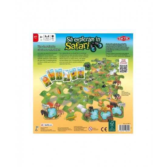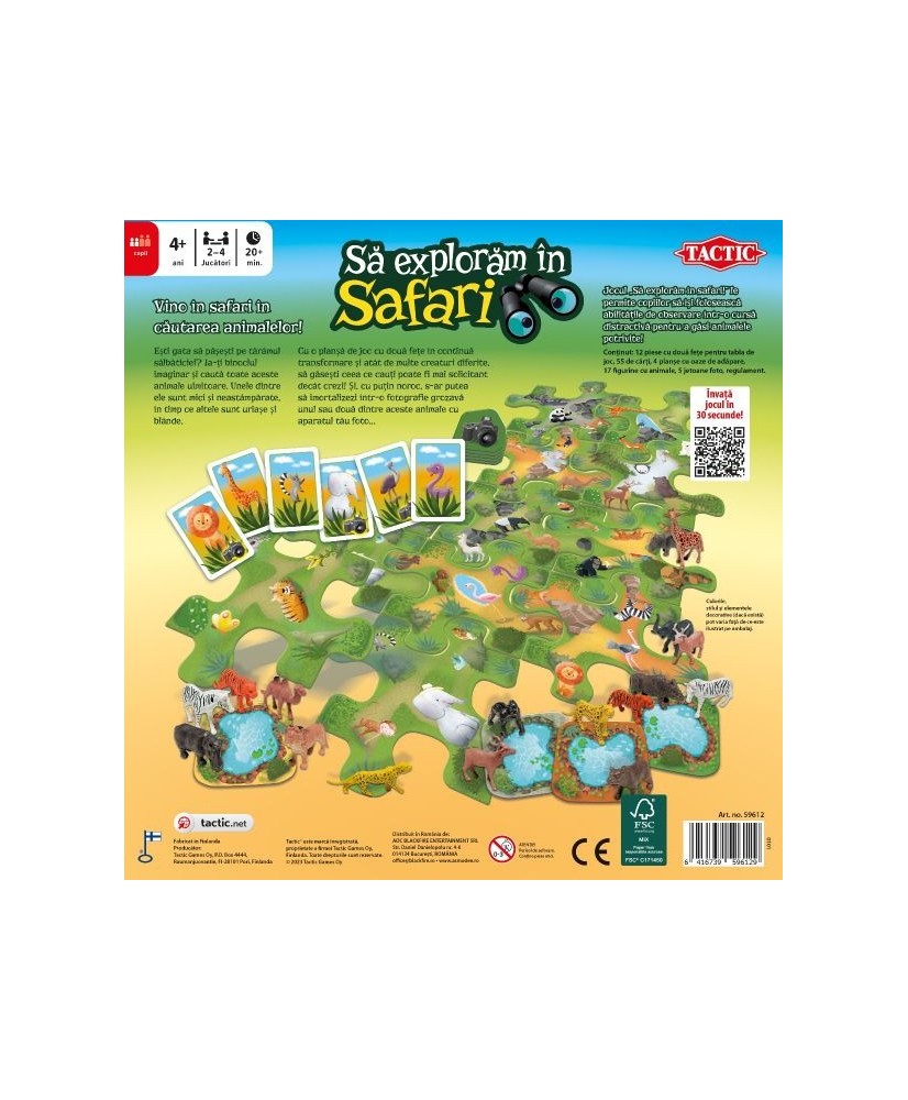 Seria Sa descoperim este o colectie de jocuri educative si distractive, concepute pentru a incuraja dezvoltarea abilitatilor cognitive si a cunostintelor intr-o maniera captivanta. Acest joc isi propune sa ofere o experienta plina de divertisment, in timp ce incurajeaza jucatorii sa invete si sa-si imbunatateasca cunostintele din diferite domenii. Fiecare titlu din seria Sa descoperim contine o selectie de jocuri si activitati care acopera o varietate de subiecte, iar fiecare joc este conceput astfel incat sa se poata adapta nivelului de cunostinte al jucatorilor, permitand astfel atat copiilor, cat si adultilor sa se bucure de aceasta experienta. Cu ajutorul acestei serii, copiii isi pot exersa abilitatile de rezolvare a problemelor, gandirea critica si strategiile, pe masura ce se angajeaza in diferite provocari si activitati. Sa exploram in Safari este un joc captivant de cautare si descoperire creat de Tactic. Acest joc incurajeaza spiritul de observatie si abilitatile de concentrare ale jucatorilor de toate varstele, oferind o experienta distractiva si provocatoare. in acest joc, participantii sunt invitati intr-o aventura fascinanta prin salbaticie, unde trebuie sa gaseasca obiecte ascunse in imagini pline de detalii. Fiecare tabla de joc prezinta un peisaj spectaculos, cum ar fi o padure tropicala sau o savana africana, in care se ascund diverse animale si obiecte. Rapiditatea si acuratetea in gasirea obiectelor vor aduce puncte si vor determina castigatorul fiecarei runde. Sa exploram in Safari ofera o modalitate distractiva de a petrece timp in familie sau cu prietenii, dezvoltand abilitatile de observatie si concentrare intr-un mod interactiv. Cu reguli simple si posibilitatea de a juca in echipa sau individual, acest joc este perfect pentru a-ti pune abilitatile de observatie la incercare si pentru a petrece momente pline de entuziasm si bucurie impreuna cu familia. Varsta recomandata 4+. 2-4 jucatori