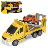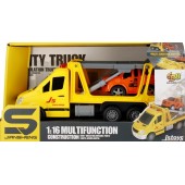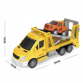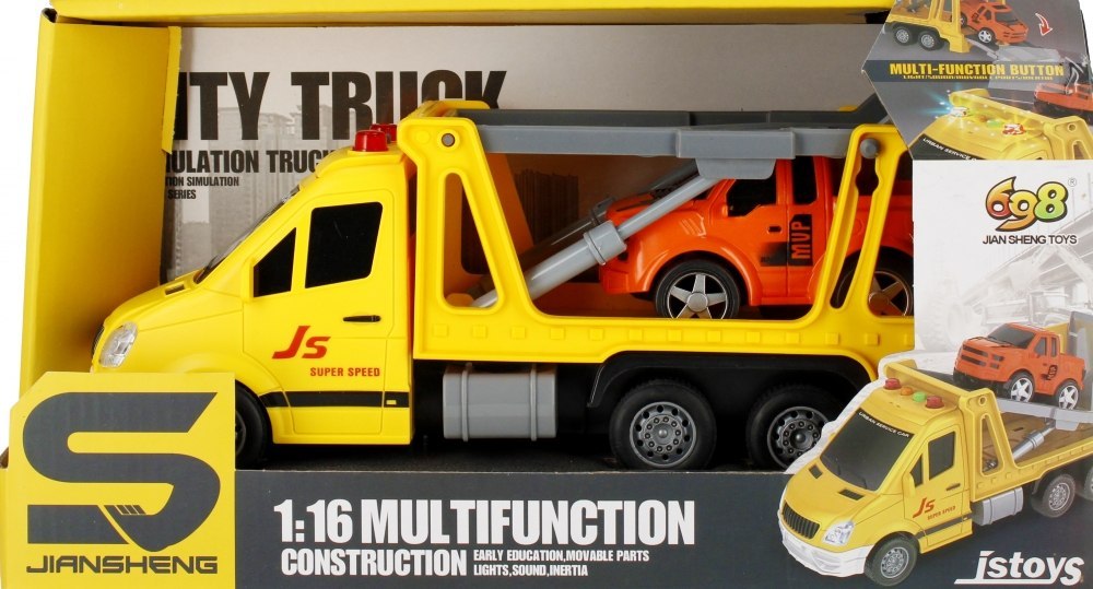Evacuator galben, cu masina portocalie, cu frictiune, sunete si lumini 1:16, jstoys