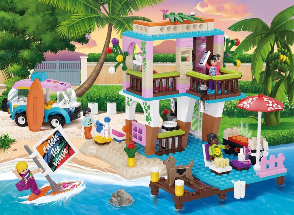 Setul combina tot ce poti visa intr-o vacanta perfecta. Elementul principal al setului este, desigur, o minunata casa de vacanta cu doua etaje, cu balcon, terasa si debarcader. Casuta are bucatarie, zona de relaxare, dormitor cu masuta de toaleta. Jucaria include, de asemenea, o masina fantastica de vacanta si o multime de accesorii pentru vacanta ta.Cutia include si minifigurine ale fetelor din Team MyGirls - Sophie, Kim, Summer si Lara.