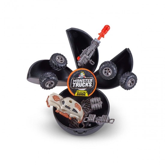 Unbox, construieste, lupta si concureaza cu 5 camioane monstru SURPRIZE! Fiecare Monster Truck este gata de construit, inclusiv roti, sasiu, bare de protectie, caroserii de camion si chiar arme care pot fi incendiate! Fiecare componenta a camionului este interschimbabila in intregul sortiment, asa ca colecteaza-le pe toate cele 7 pentru a crea Monster Truck suprem. Ai grija la camionul super rar Ghost Rider pentru cursa si batalia suprema. Pe care o vei despacheta?