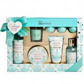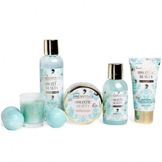 Experimentati bucuria ingrijirii pielii cu setul de baie IDC Institute Holistic Beauty Descoperiti pielea radianta, hranita si improspatata cu infuzia calmanta de lotus si ceai alb. Acest set de ingrijire include: 150ml gel dus, 100ml spuma baie, 60ml lotiune corp, 60ml exfoliant, 3 x 20g bile solubile de baie, o lumanare parfumata . Avertismente: Uz extern. Nu lasati la indemana copiilor. Depozitati in mediu uscat, ferit de lumina soarelui, la temperaturi intre 5-25 grade C, cu capacul inchis cu grija.