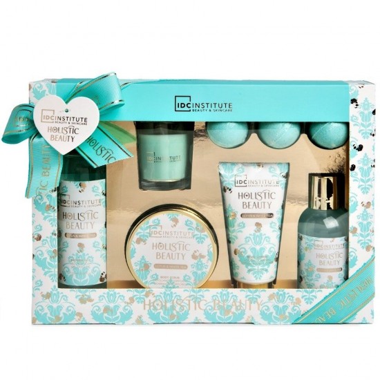 Set gel dus, spuma baie, lotiune corp, exfoliant, 3 bile solubile de baie Holistic Beauty, IDC Institute