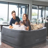 Patul gonflabil Queen Comfort-Plush este proiectat pentru utilizare confortabila si stabilitate ridicata, fiind ideal ca pat suplimentar sau pentru vacante. Inaltimea generoasa de 56 cm faciliteaza accesul si ofera o pozitie de dormit apropiata de cea a unui pat clasic. Suprafata catifelata este placuta la atingere si ajuta la mentinerea lenjeriei pe pozitie, in timp ce structura interna cu tehnologie Fiber-Tech asigura o sustinere uniforma pe intreaga suprafata. Pompa electrica incorporata permite umflarea si dezumflarea rapida printr-o simpla apasare de buton, oferind o solutie practica si eficienta pentru odihna.