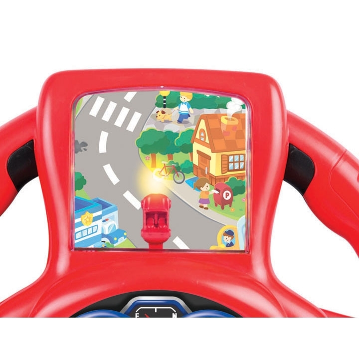 Contine sunete specifice masinii, joc captivant cu masinuta care merge in momentul in care volanul este miscat, claxon functional.
