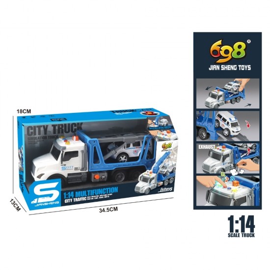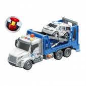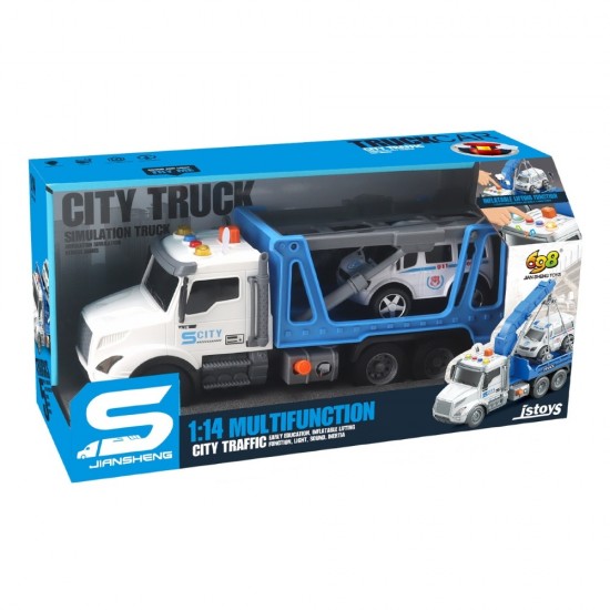 Camion evacuator albastru cu frictiune, buton presiune, sunete si lumini, 1:14, jstoys, ZJA363789
