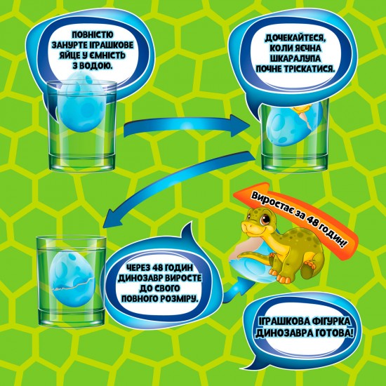 Scufundati oul complet intr-un recipient cu apa. Asteptati sa crape coaja de ou. Dupa 48 de ore, jucaria dinozaur va creste la dimensiunea maxima.