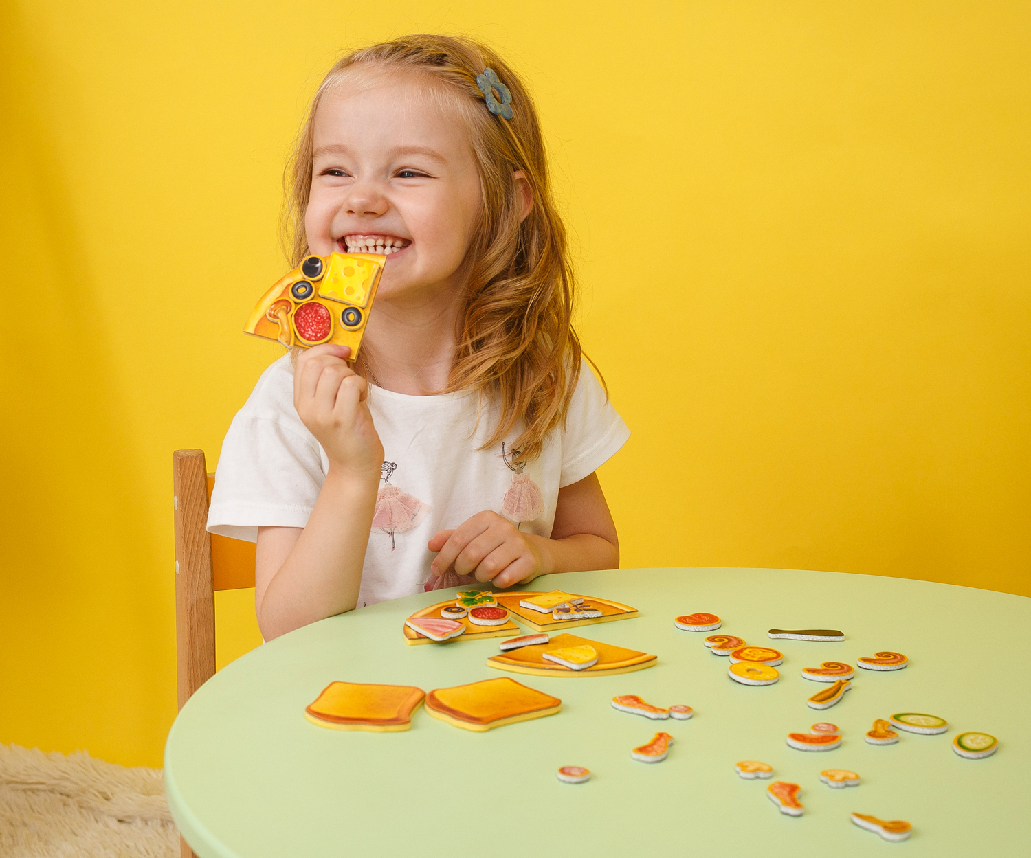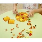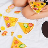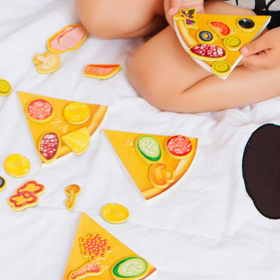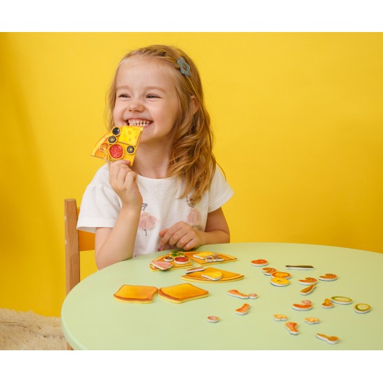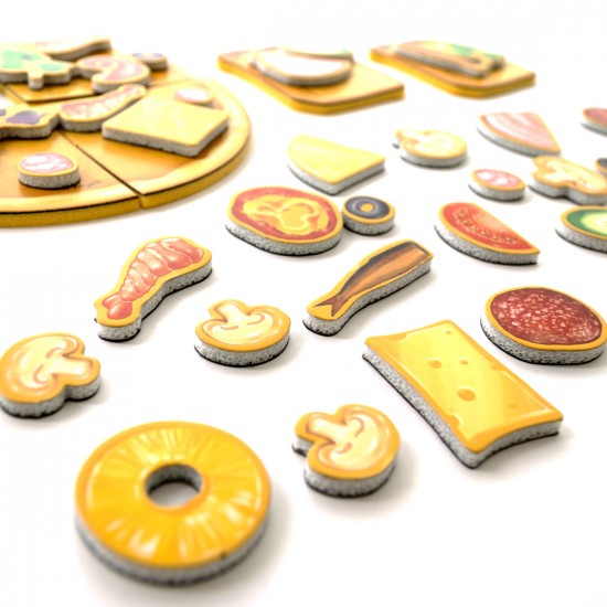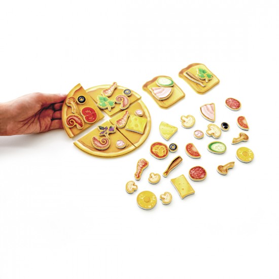 Set complet: 4 felii de pizza, 2 paine prajita, 41 ingrediente magnetice. Confectionat din materiale polimerice.