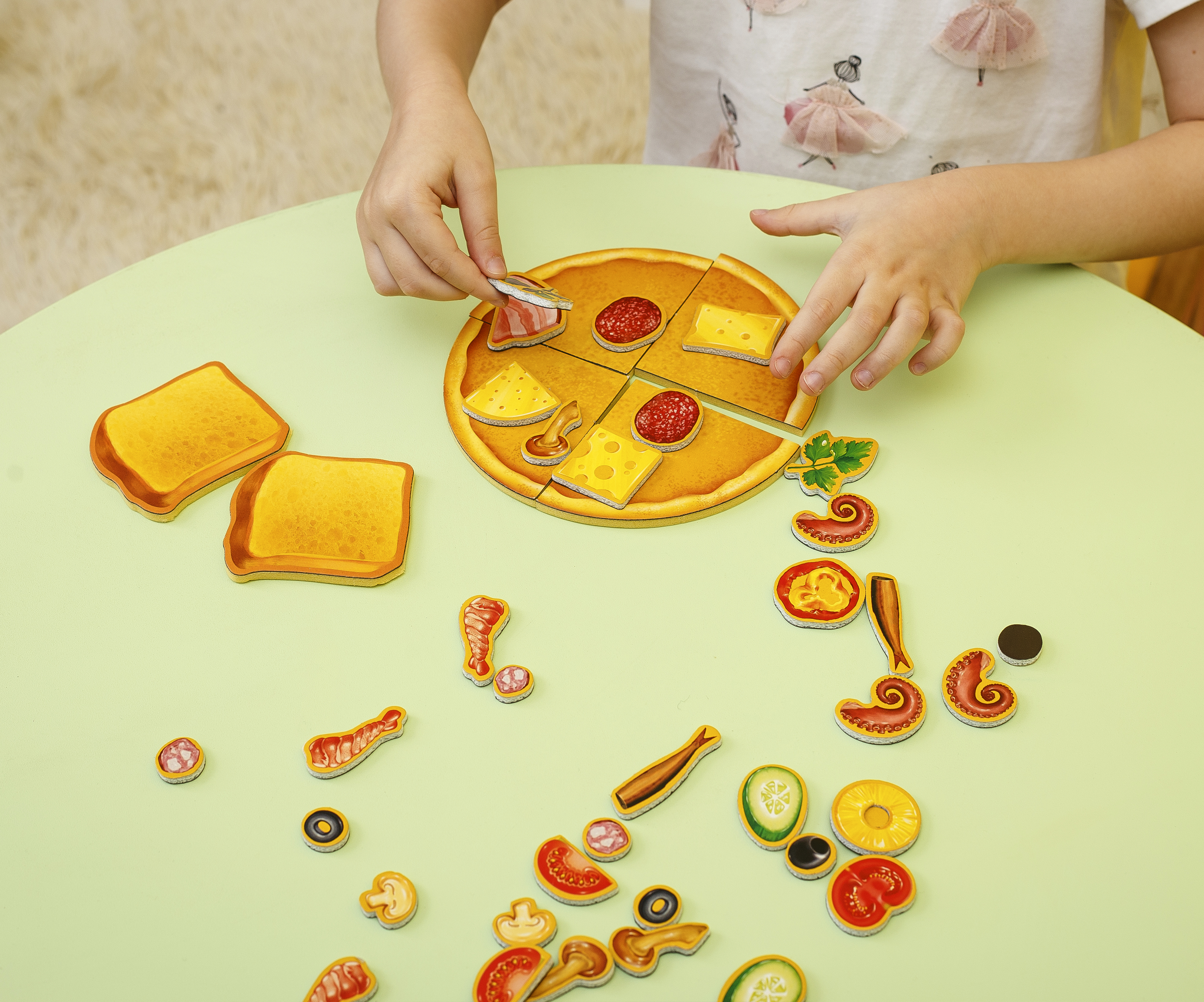 Crevetii magnetici, ciupercile, maslinele deschid spatiul pentru imaginatia copiilor. Inventeaza umplutura de pizza la alegerea ta si creeaza-ti capodopera culinara. Capricciosa, Margarita, vegetariana - orice. Cand bucatele sunt gata, invitati prietenii la cina si jucati-va impreuna!