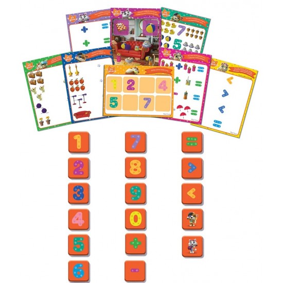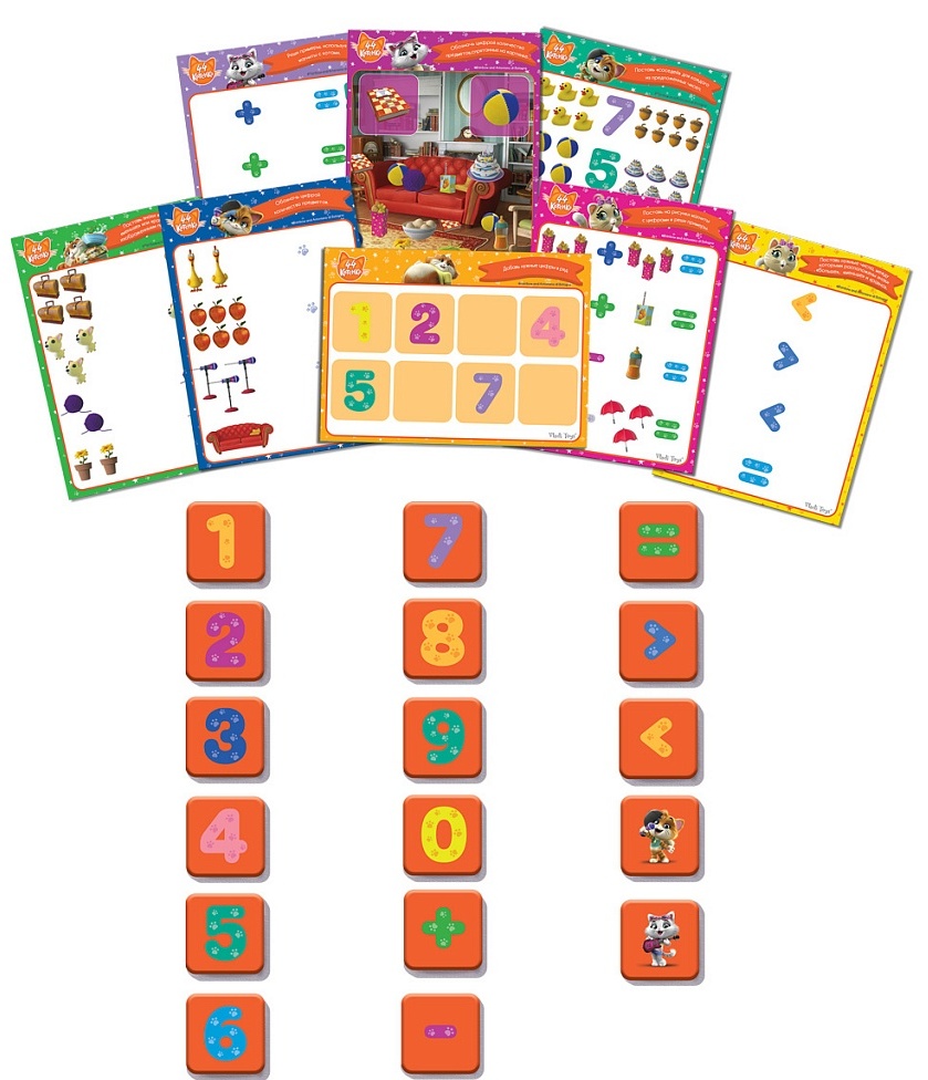 Invatati cifrele impreuna cu motanasii veseli. Prietenii pufosi au pregatit pentru micut cifre magnetice moi, care ii vor pune bazele matematicii. Pe cartonase veti gasi diverse sarcini pe care trebuie sa le indepliniti. Repetati cifrele si rezolvati ecuatii impreuna cu eroii desenului animat "44 de motanasi".