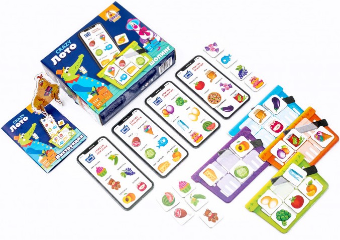 Joc de masa pentru copii. Participantii la joc aduna jetoanele cu produse la viteza. Cistiga cel care acopera cel mai repede masa de joc.