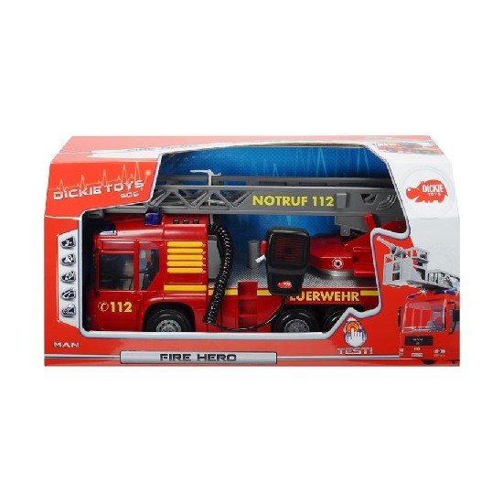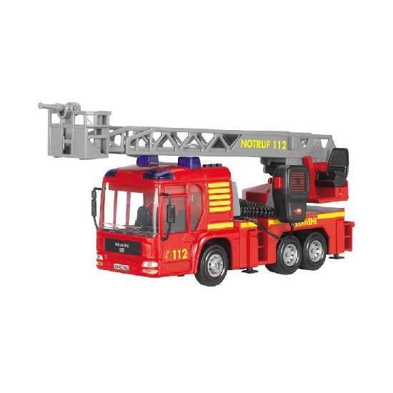 Пожарная машина с подвижными частями, рацией и водяным насосом, которая работает от нажатия на кнопку. Пожарная машина оснащена звуковыми (сирена) и световыми (мигалка) функциями. Кроме того, машина обладает реалистичной функцией разбрызгивания воды, имитируя тушение пожара. В специальный резервуар на кузове машины заливается вода и, при нажатии кнопки, разбрызгивается из брандспойта. У пожарной машины выдвигается и поворачивается пожарная стрела, а также выдвигаются подножки.