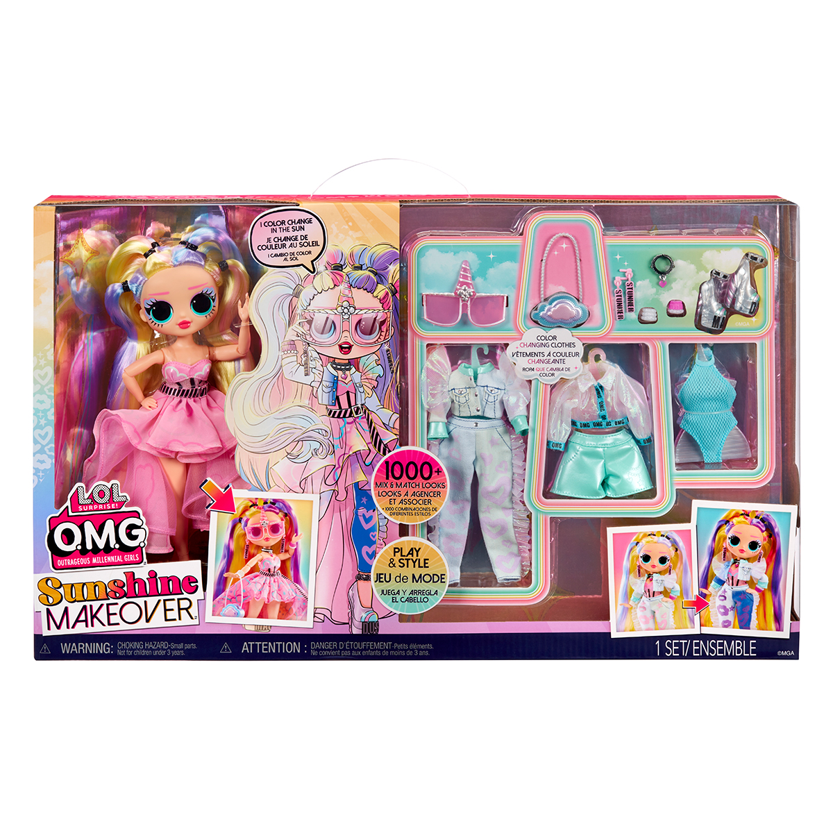 Представляем игровой набор с куклой L.O.L. Surprise! серии 'O.M.G. Sunshine Makeover' – Большой сюрприз. Вас ждет множество еще больше сюрпризов и эксклюзивная куколка. Элементы волос и одежды красавицы O.M.G. серии «Sunshine Makeover» меняют при солнечном свете или под ультрафиолетовой лампой. Найдите секретное превращение своей куколки, одежды и аксессуаров.