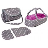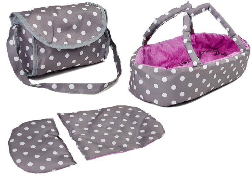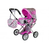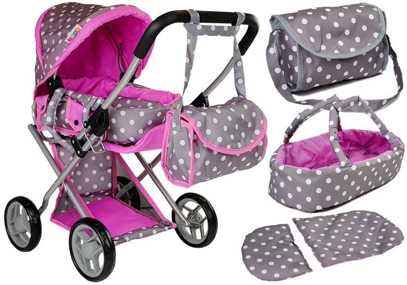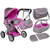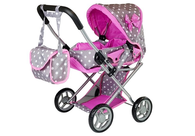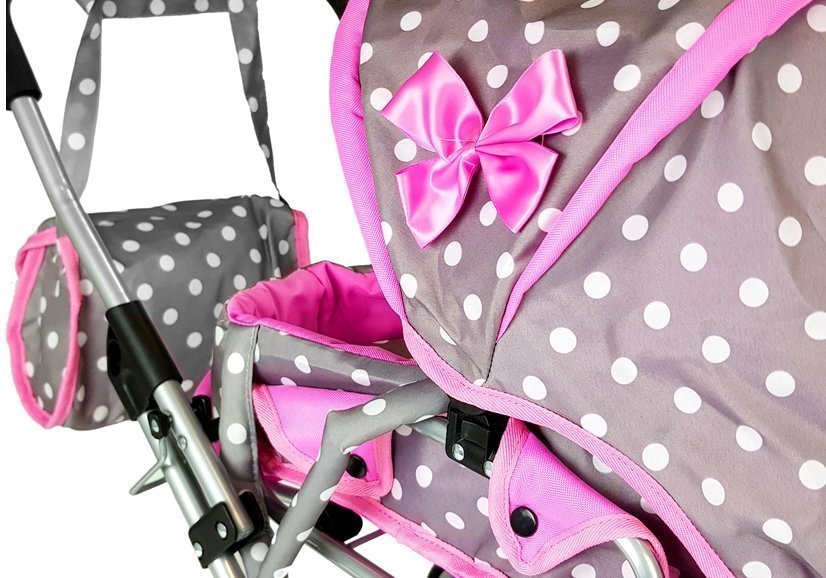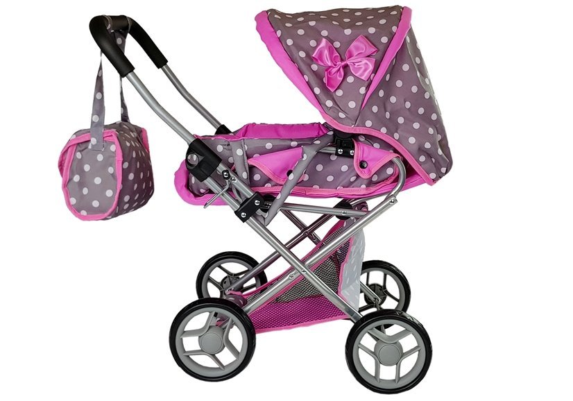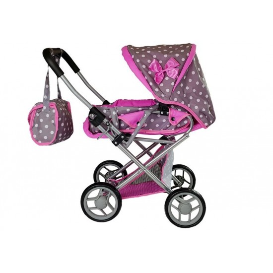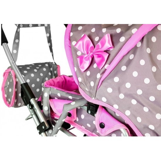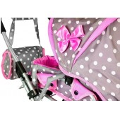 Коляска для куклы Алиса с серо-розовой сумкой в горошек