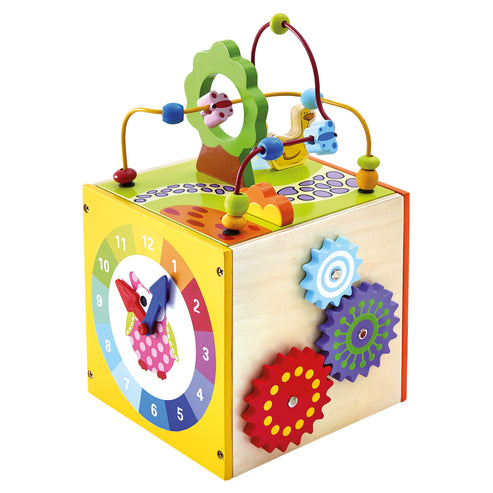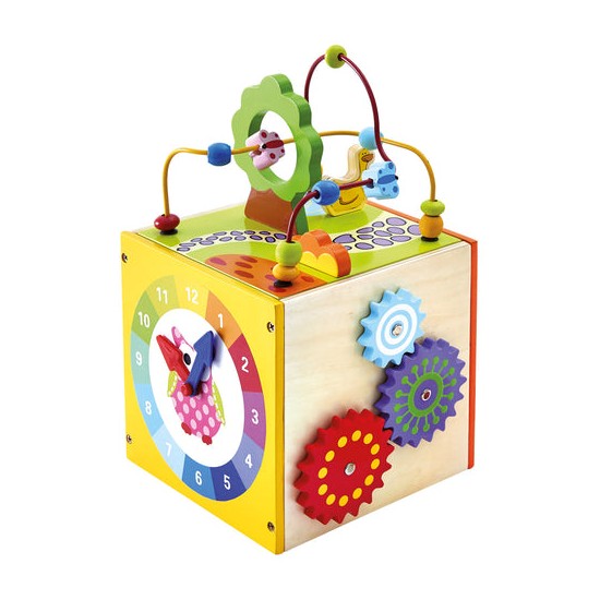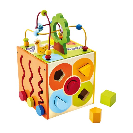 Образовательные элементы куба включают в себя: фигуры, которые нужно рассортировать, колеса, которые можно вращать, детали, которые нужно перемещать, изображения, числа и формы, которые нужно распознавать.