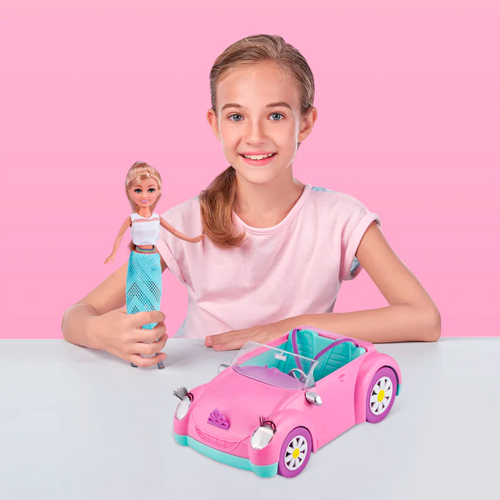У этой машины есть вращающиеся колеса, стильные шины и интерьер, поэтому ваши куклы всегда смогут путешествовать в лучшем виде.