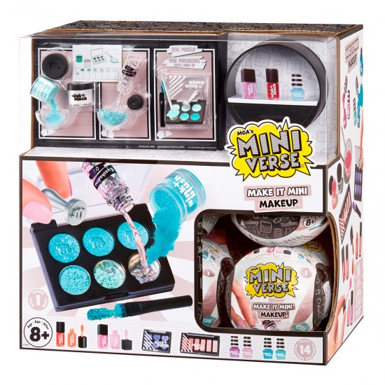 Ощутите себя настоящим визажистом с Miniverse Makeup! Создавайте мини-блески для губ, тени или лаки для ногтей своими руками. Каждый шарик-сюрприз содержит крошечные баночки, кисточки, пигменты, жидкость для блеска, а также мини-столик или подставку для демонстрации.