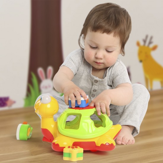 Crusta broscutei testoase, are 4 gauri sub forma de diverse figuri geometrice. Copilul trebuie sa anexeze figurile furnizate in gaurile corespunzatoare. Daca copilul indeplineste corect cerinta , atunci broasca testoasa numeste figura geometrica potrivita, culoarea sau animalul, spune poezia despre proprietatile sale sau cinta un cintec vesel, clipind cu lumini. Toate cele 4 figuri se transforma cu usurinta in animale amuzante. Astfel ajuta la dezvoltarea gindirii, motoricii fine si coordonarea miscarilor copilului. Jucaria este expusa in limba rusa. Functioneaza cu 2XAA incluse in set.