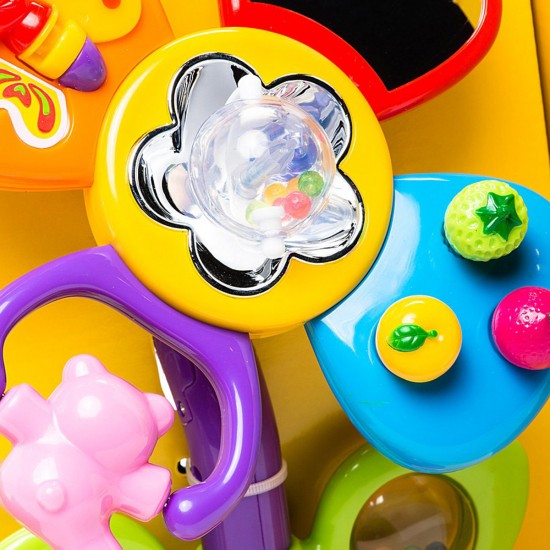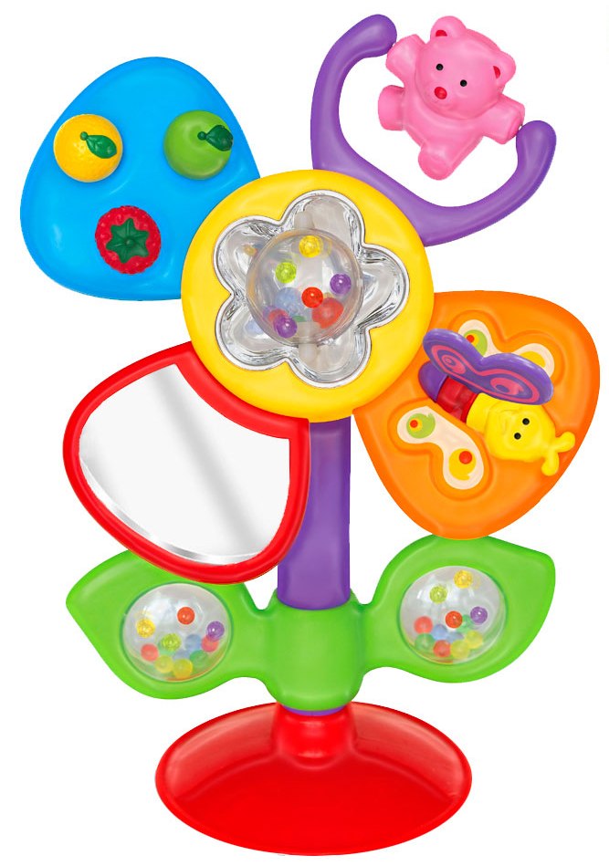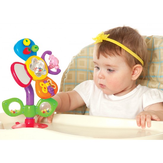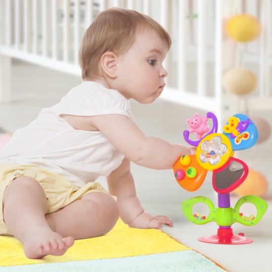 Jucaria cu ventuza ,, Floare ", este o jucarie muzicala multifunctionala, sonorizata in limba rusa. Poeziile despre fructe se afla pe petalele unei flori cu oglinda sigura si un ursulet rotativ il va interesa cu siguranta pe copilul tau. Intorcind aripa fluturelui, copilul v-a auzi o melodie vesela despre floare si o poezie amuzanta despre fluture. Floarea se invarte cu zgomotul unei zornaietoare iar frunzele zgomotoase se invart. Jucaria poate fi fixata pe orice suprafata neteda, inclusiv pe o masa de hranire. Functioneaza cu 2xLR44 incluse in set.